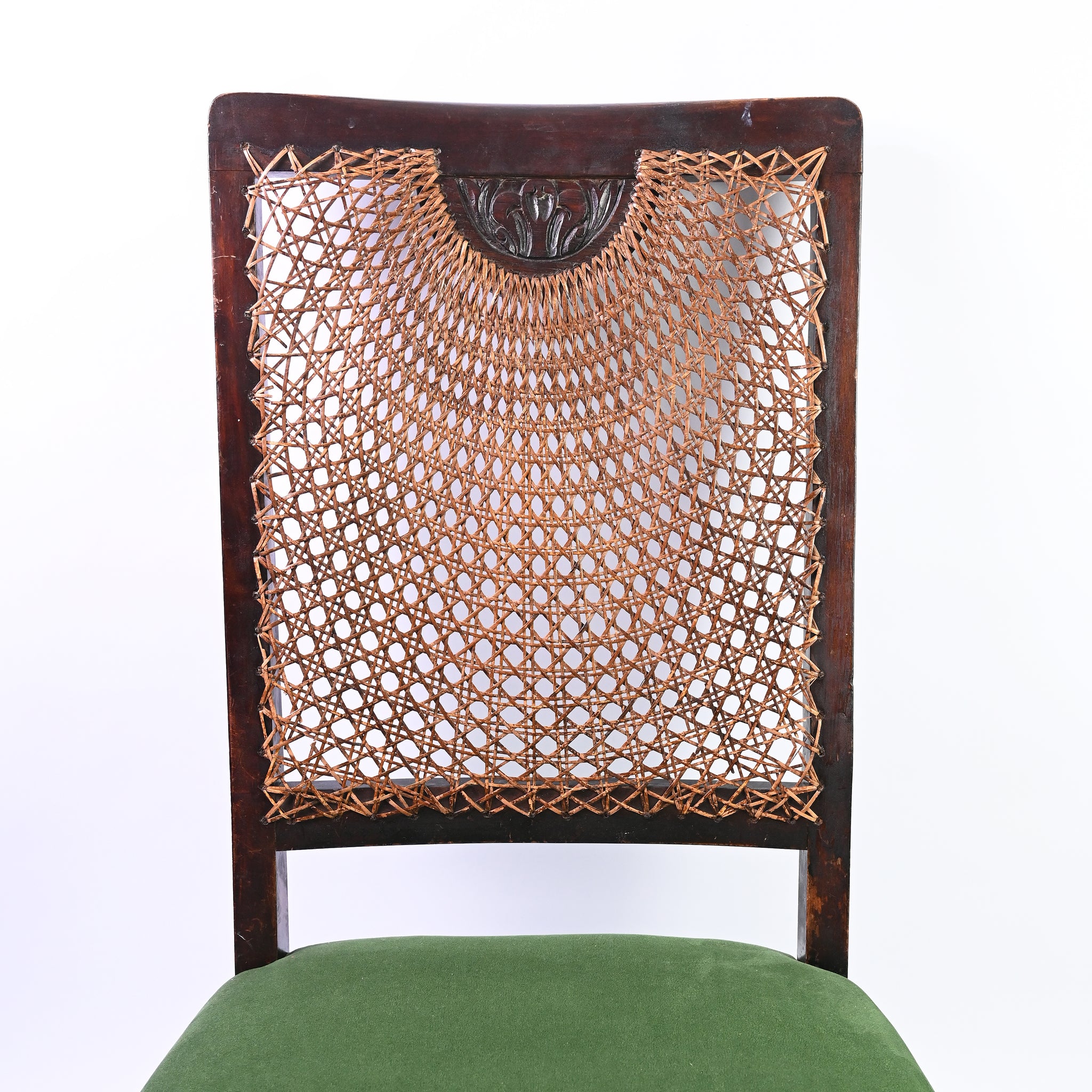 A very sweet carved oak nursing chair with cane back, reupholstered in a plush fern...