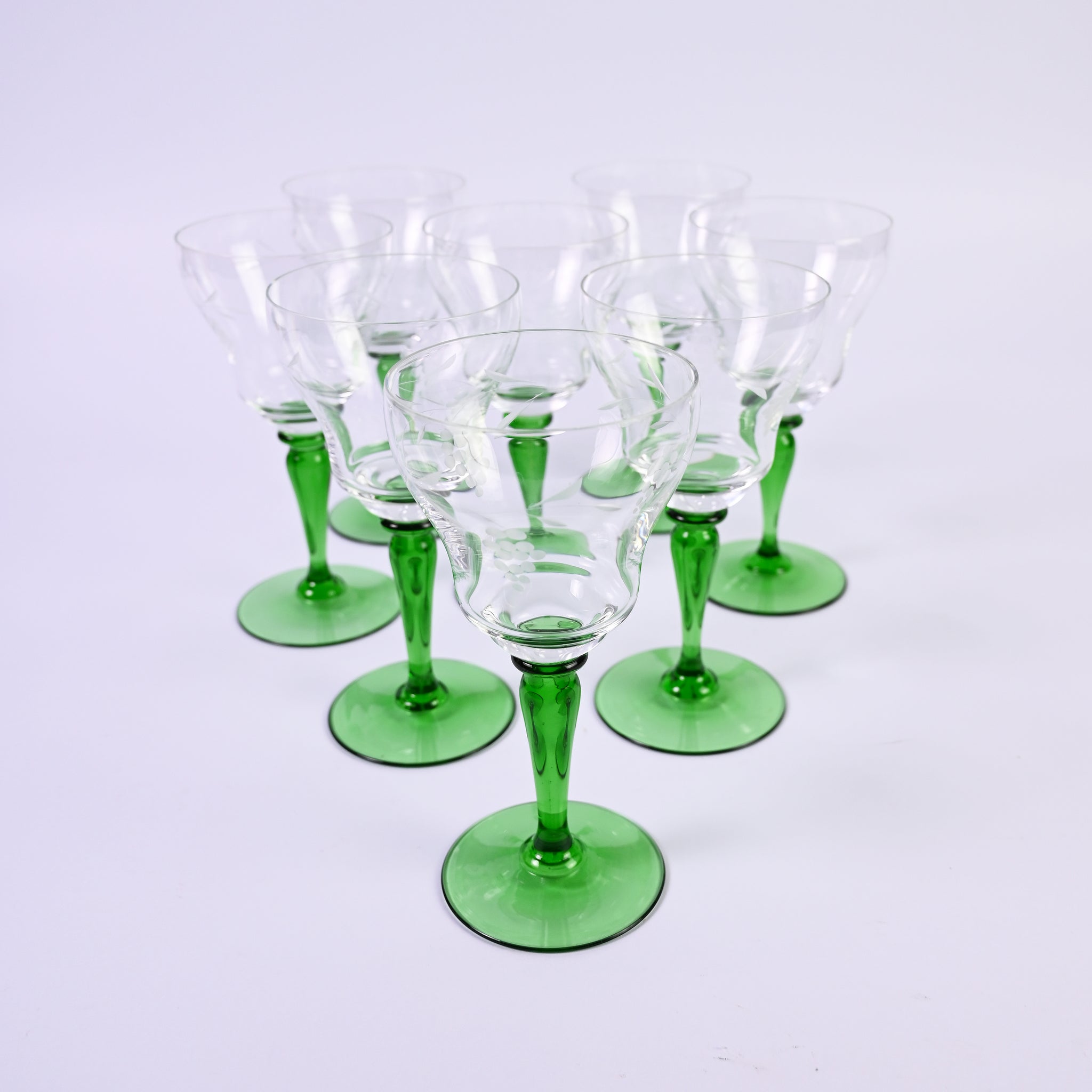 Set of eight elegant, long green. stemmed wine glasses with etched vine leaf and grapes....