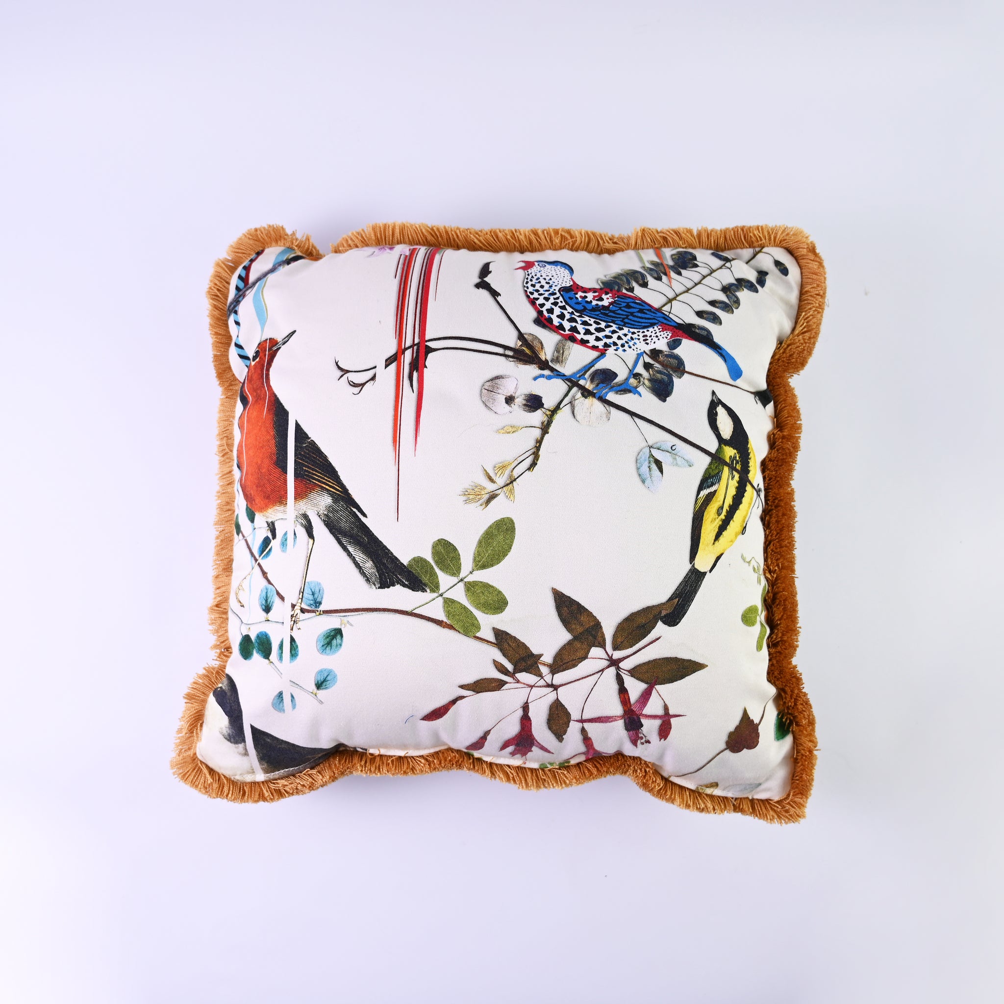 Luxurious Christian Lacroix colourful birds cushion with mustard fringe. L - 38cm W - 38cm