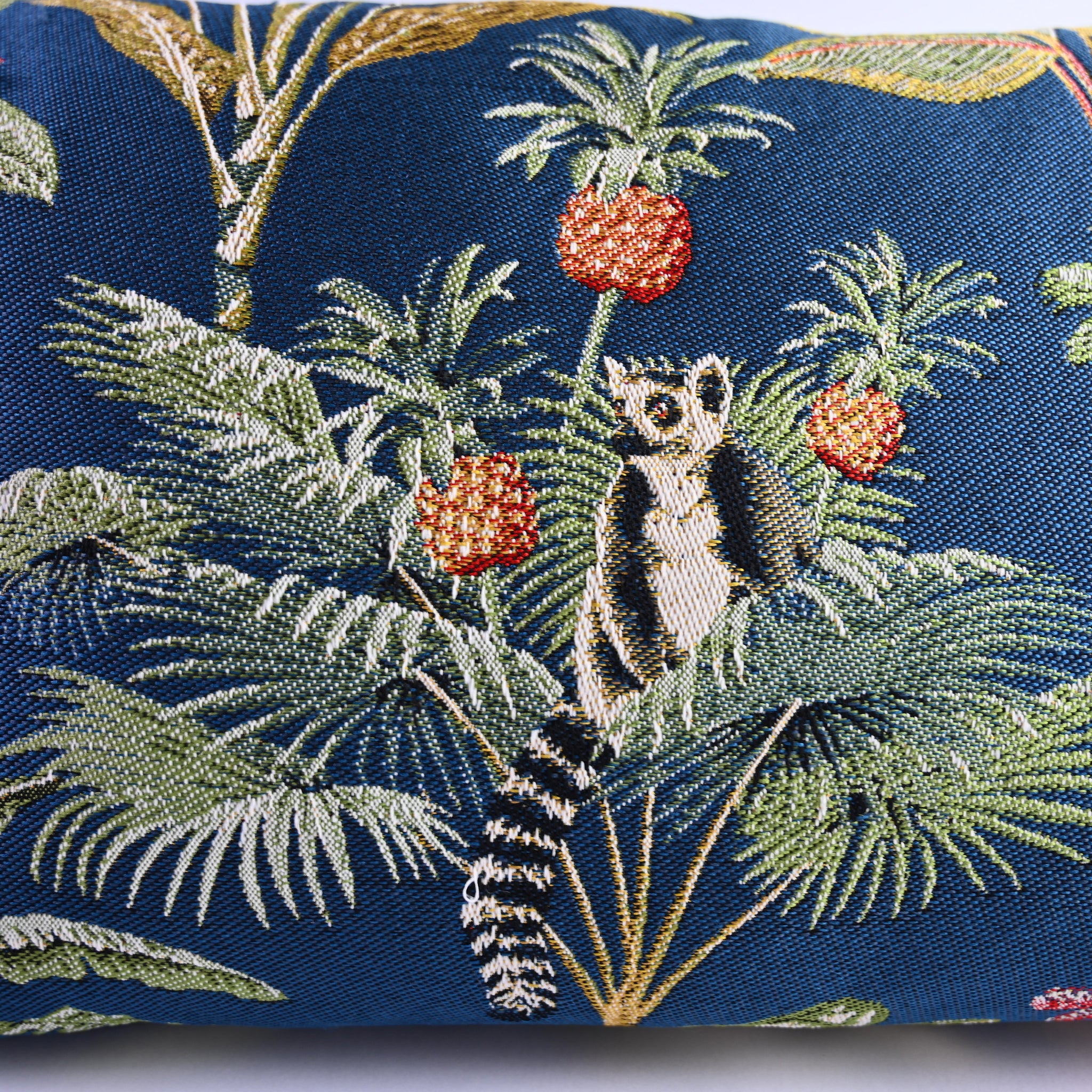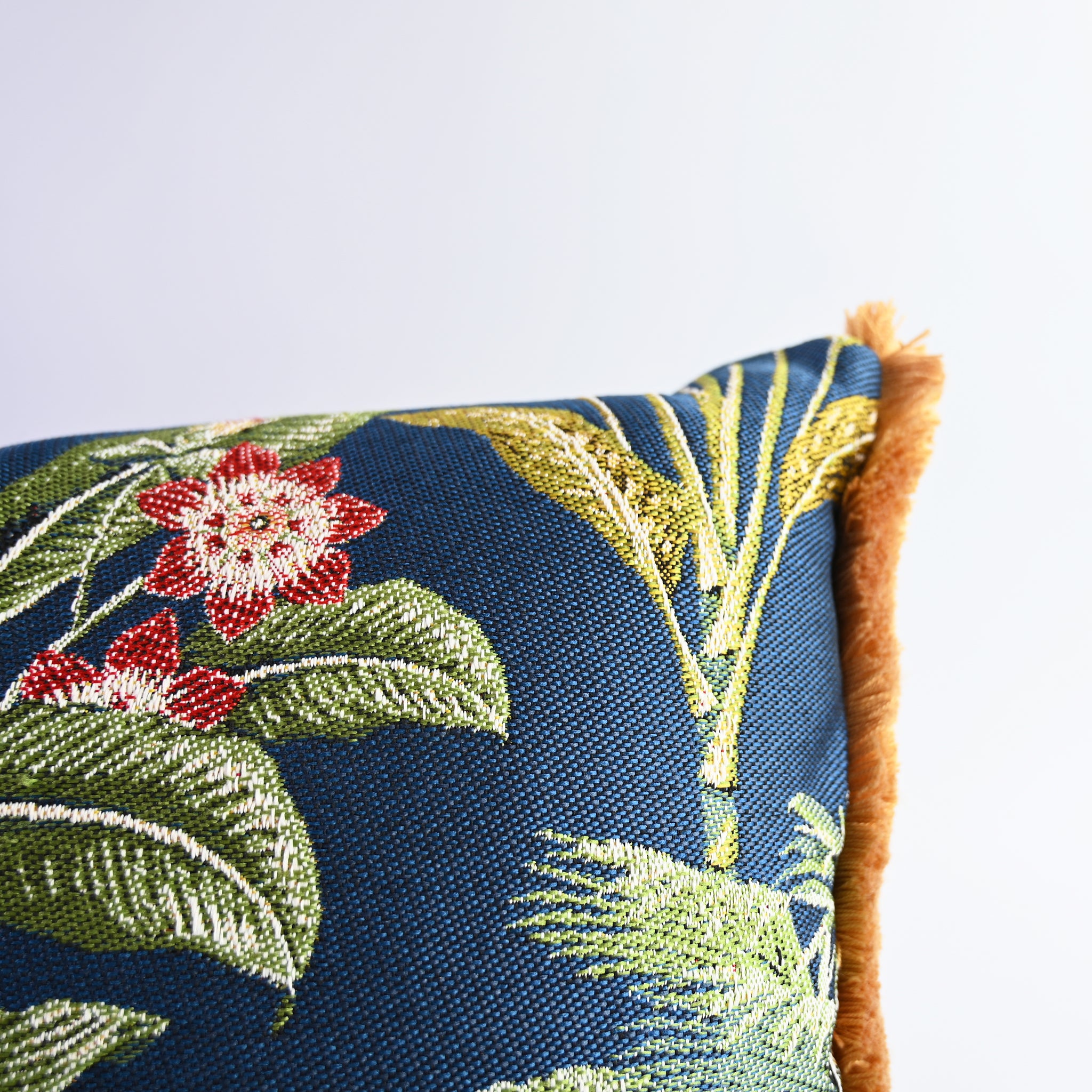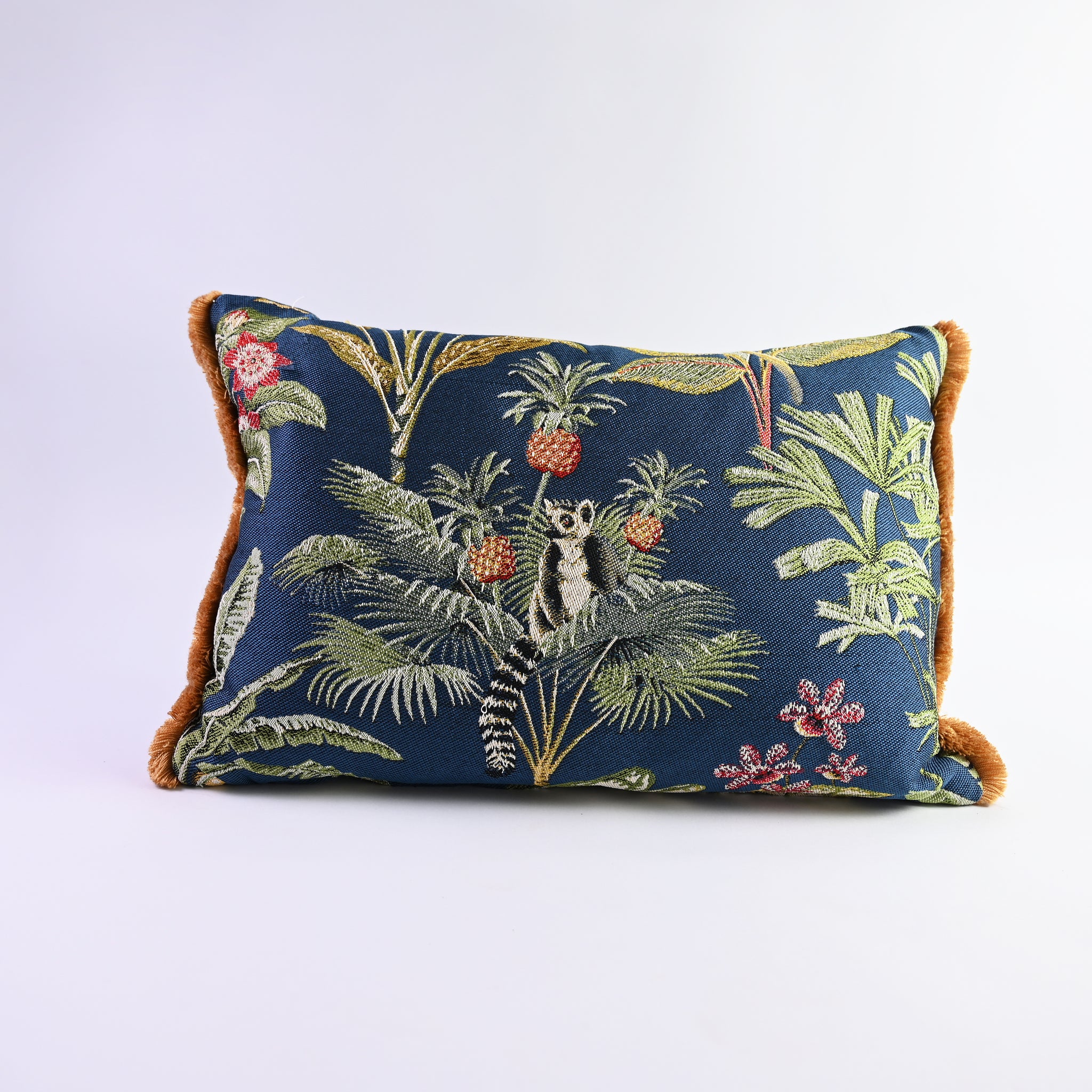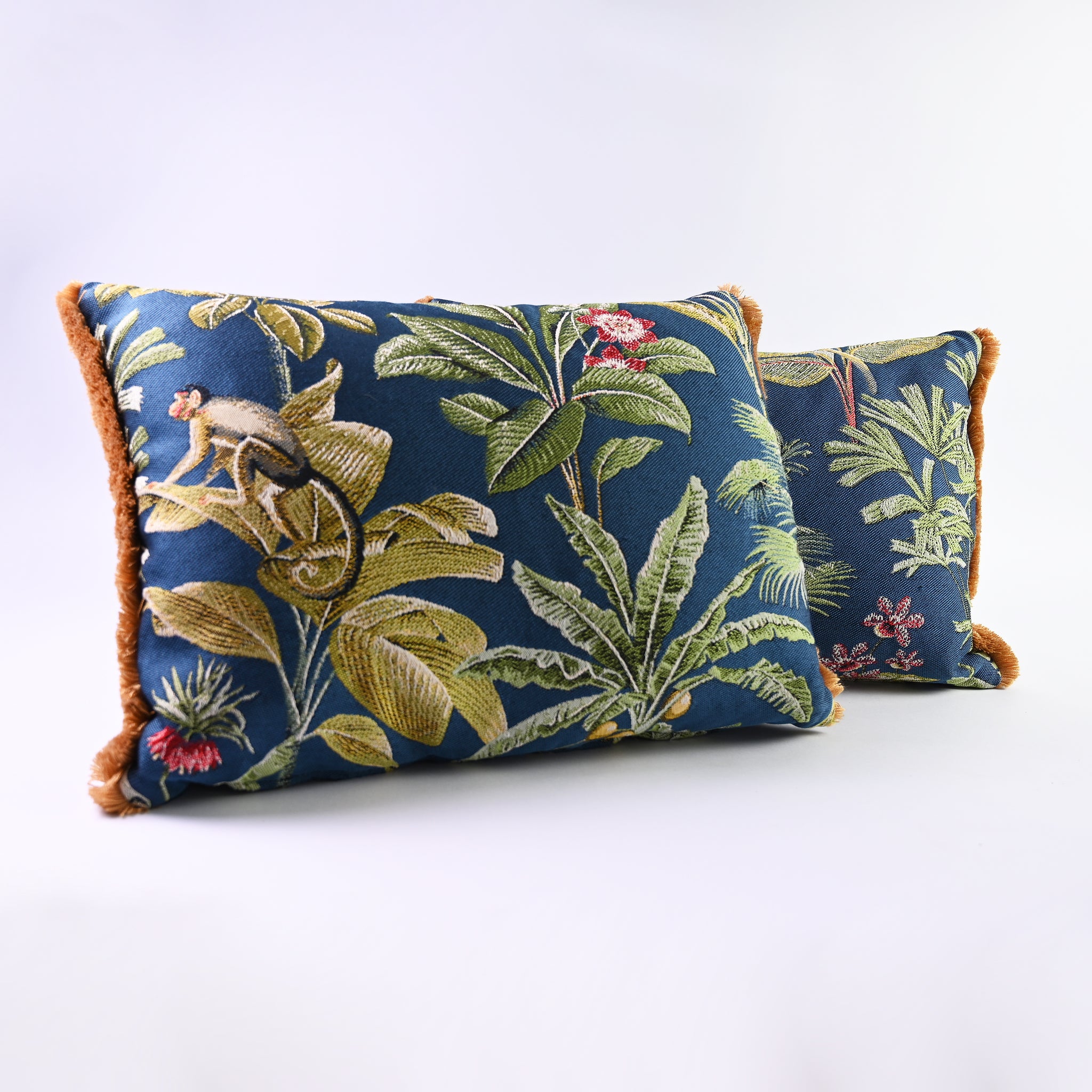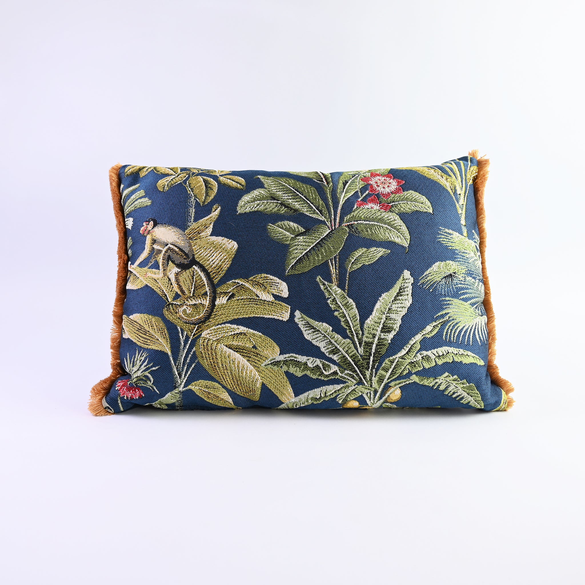 Luxurious teal velvet backed jungle cushion with mustard fringe. L - 44cm W - 30cm