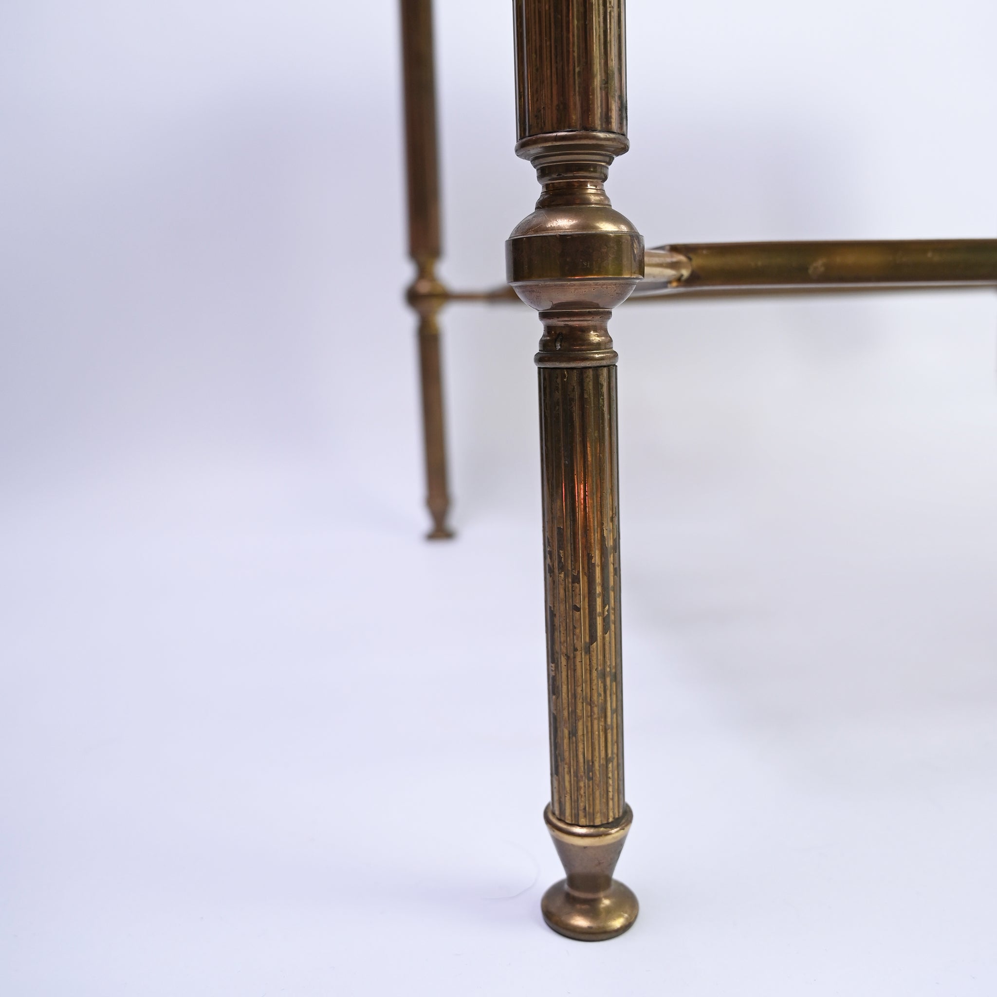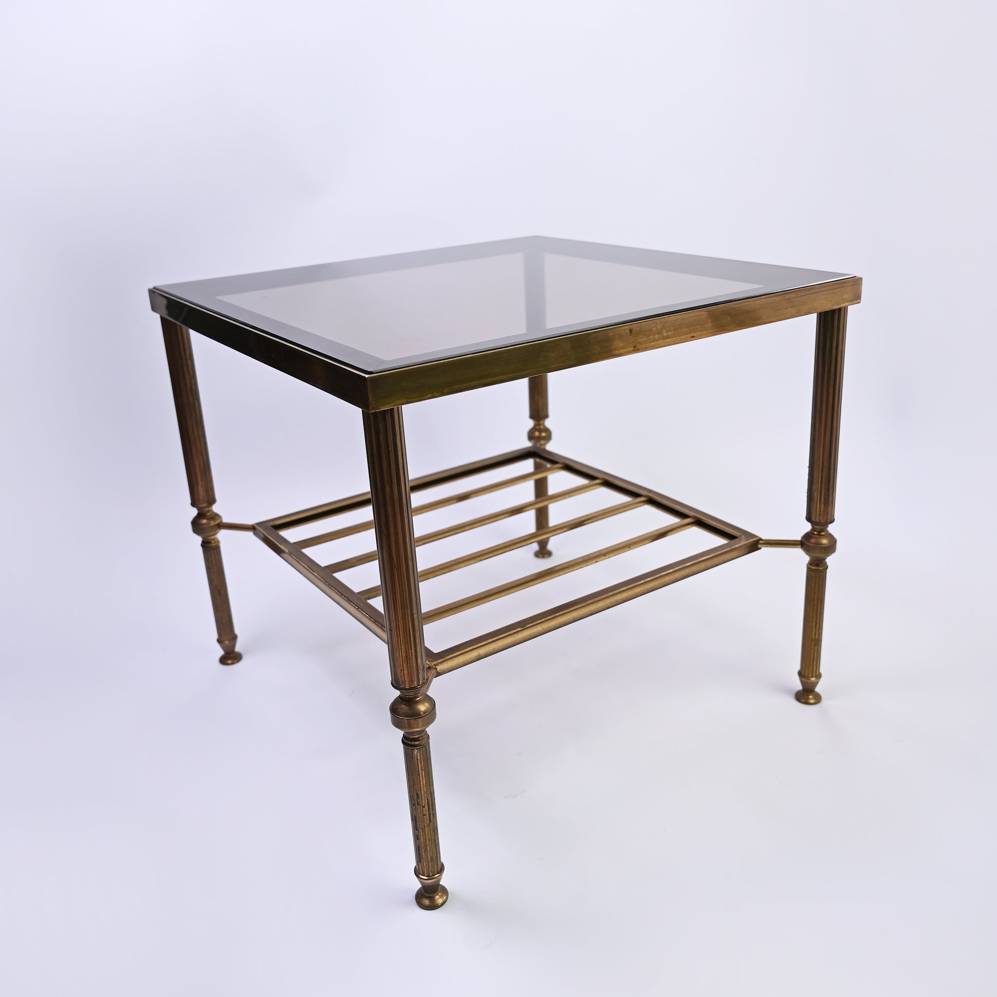 Elegant brass table with smoked glass top and magazine shelf.