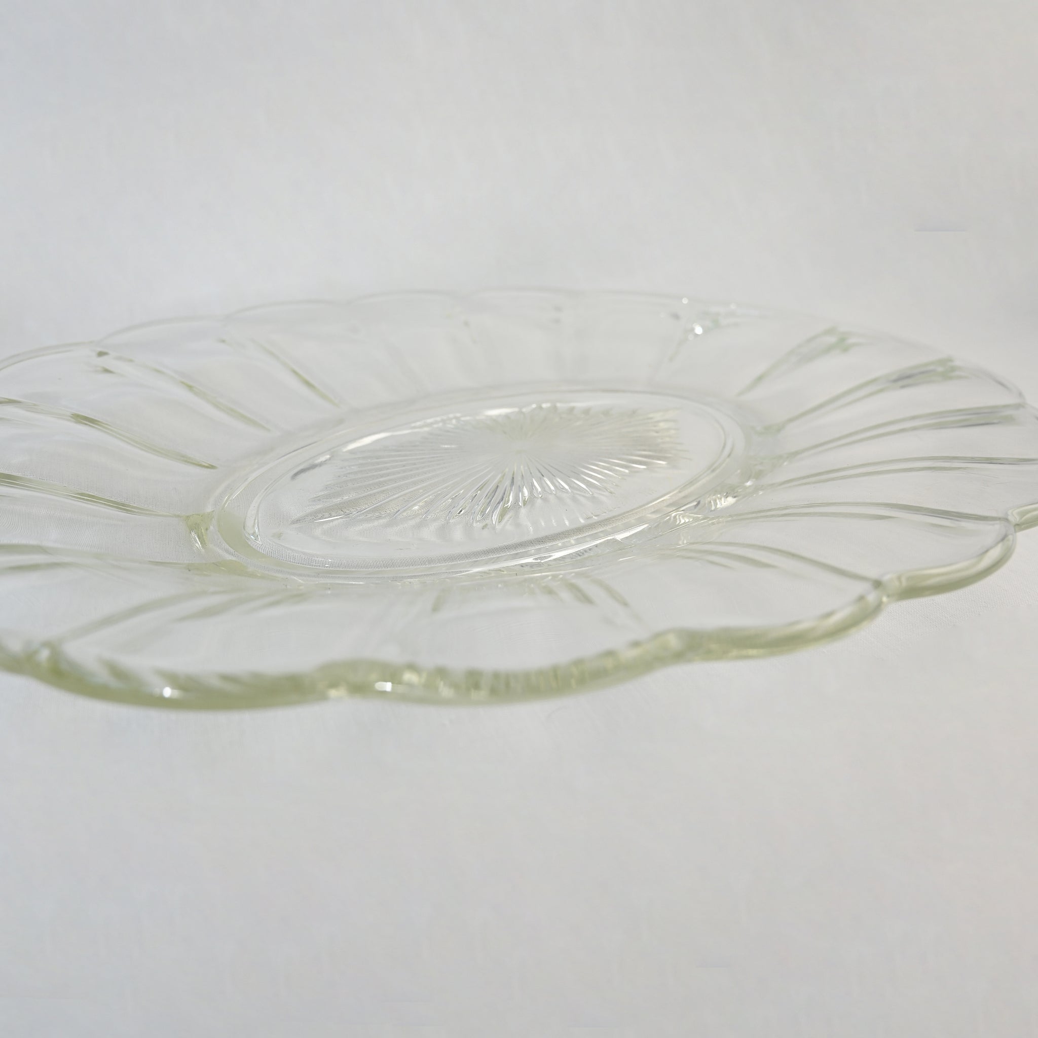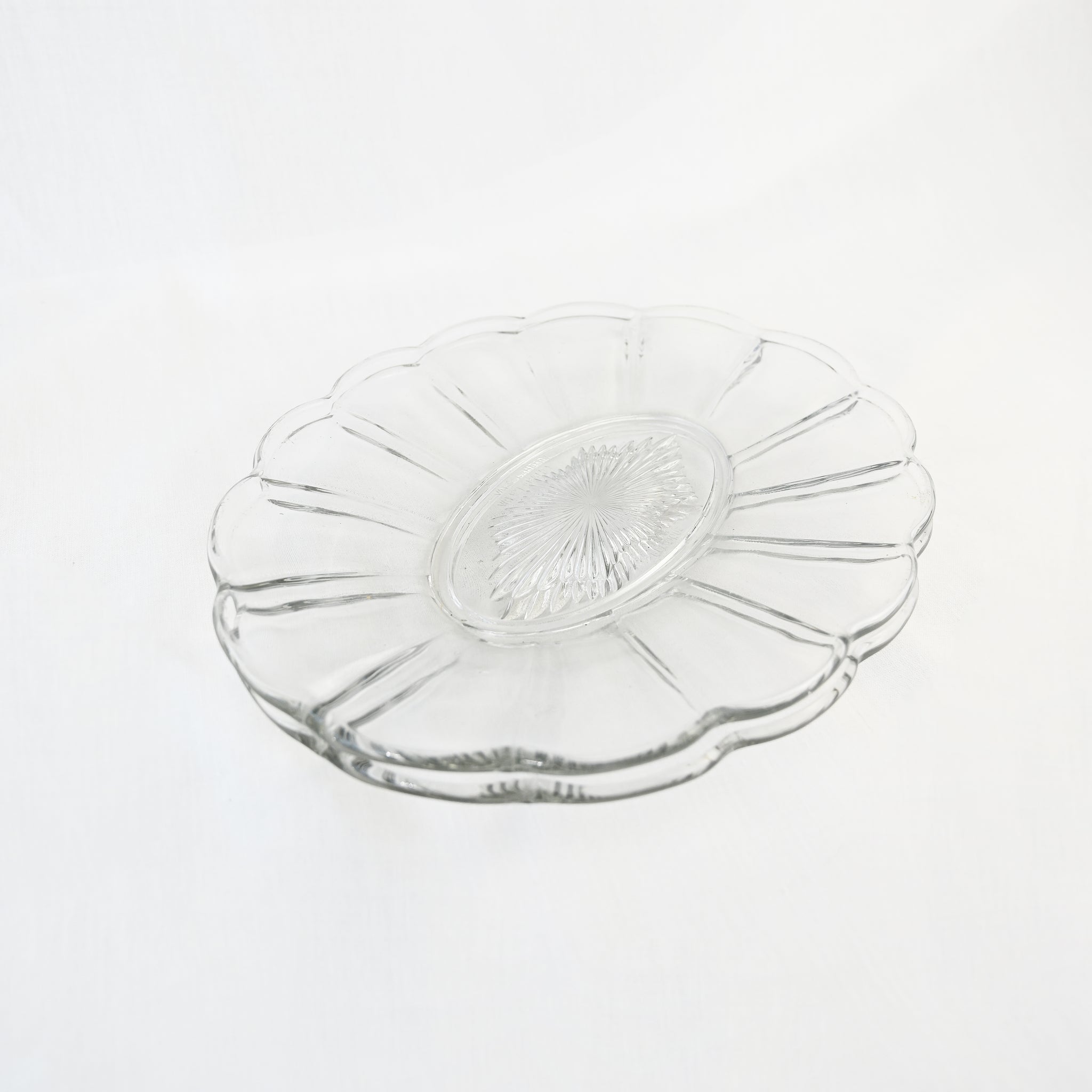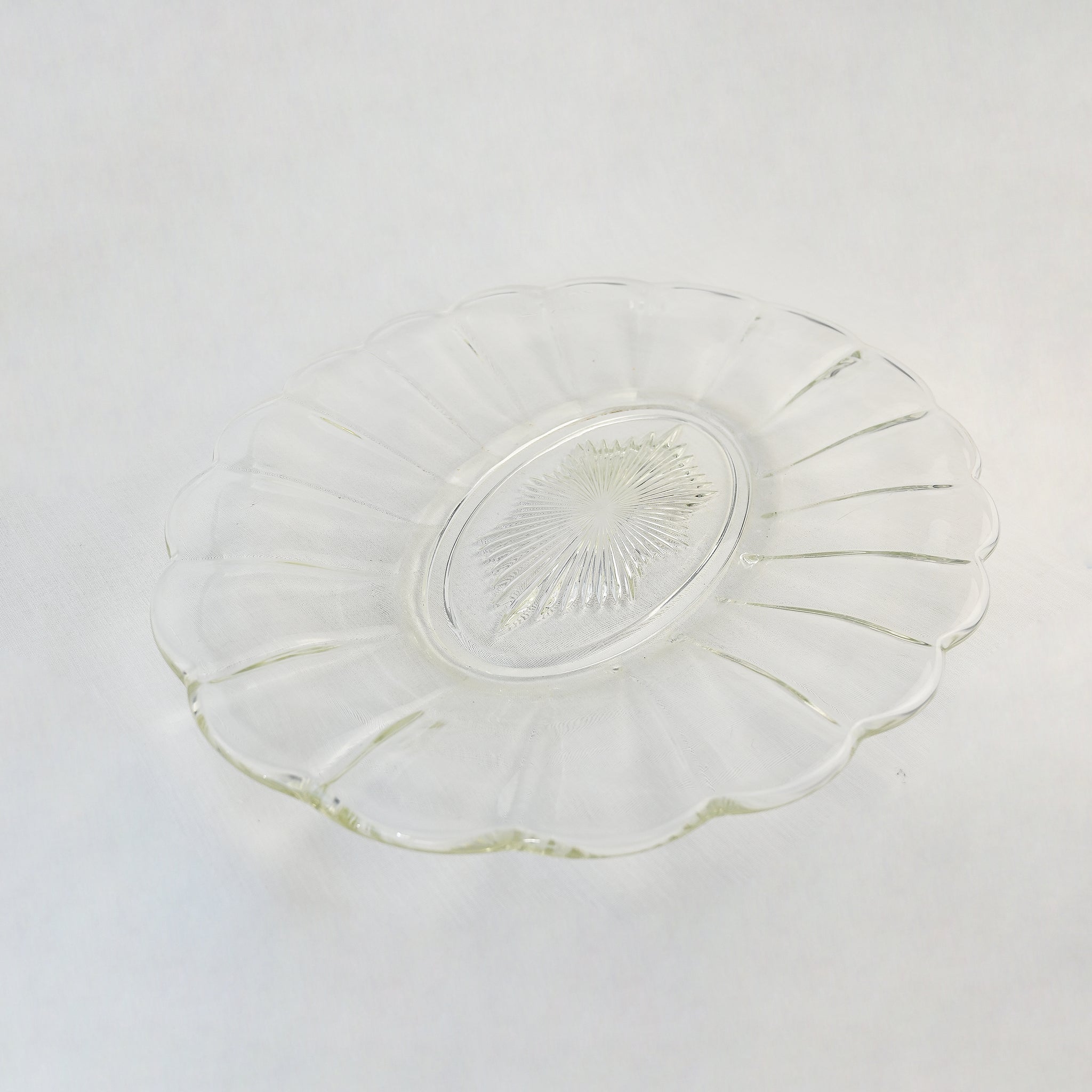 Beautiful oval glass serving dish with scallop edge and cut glass star base. H -...